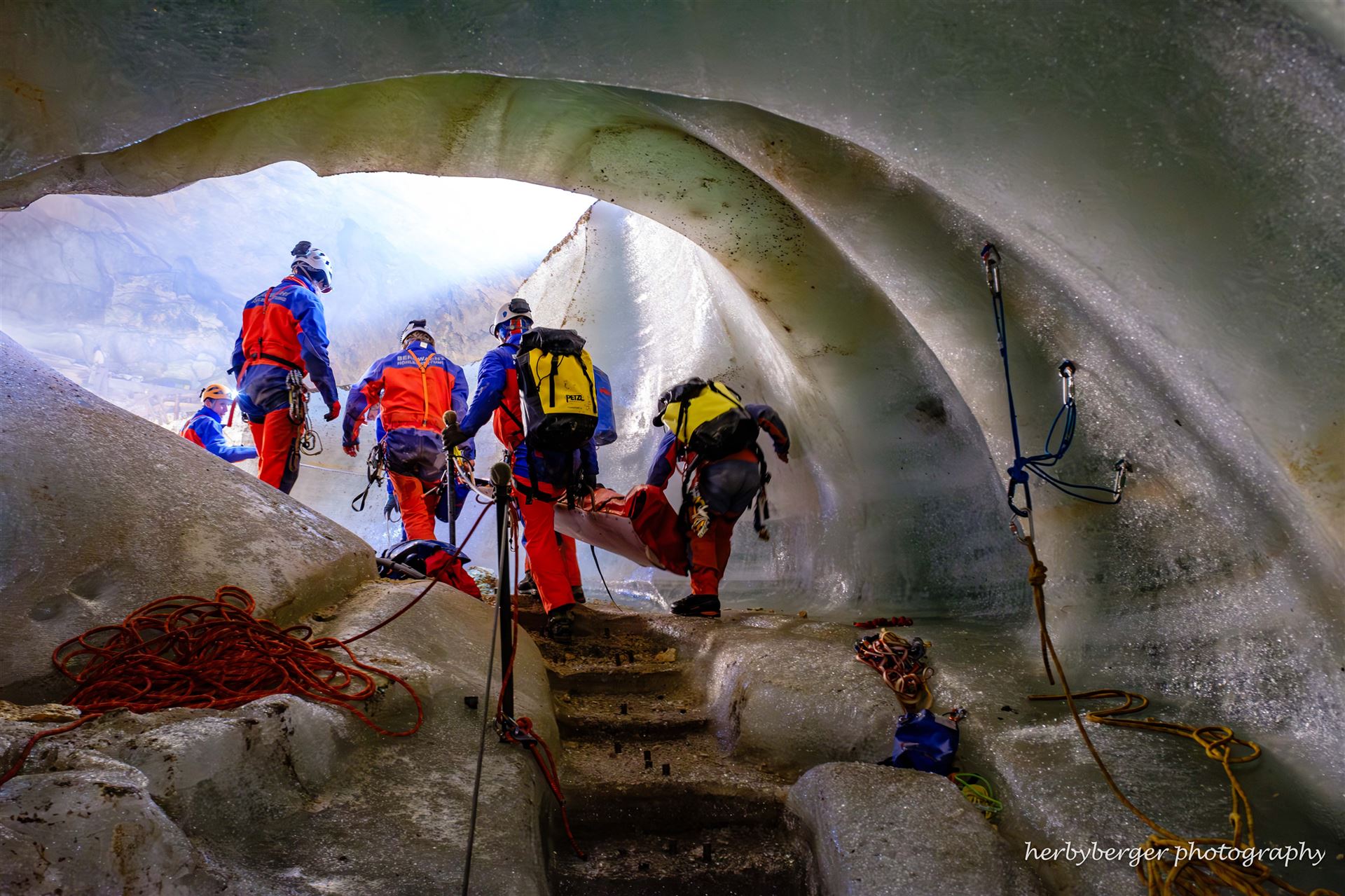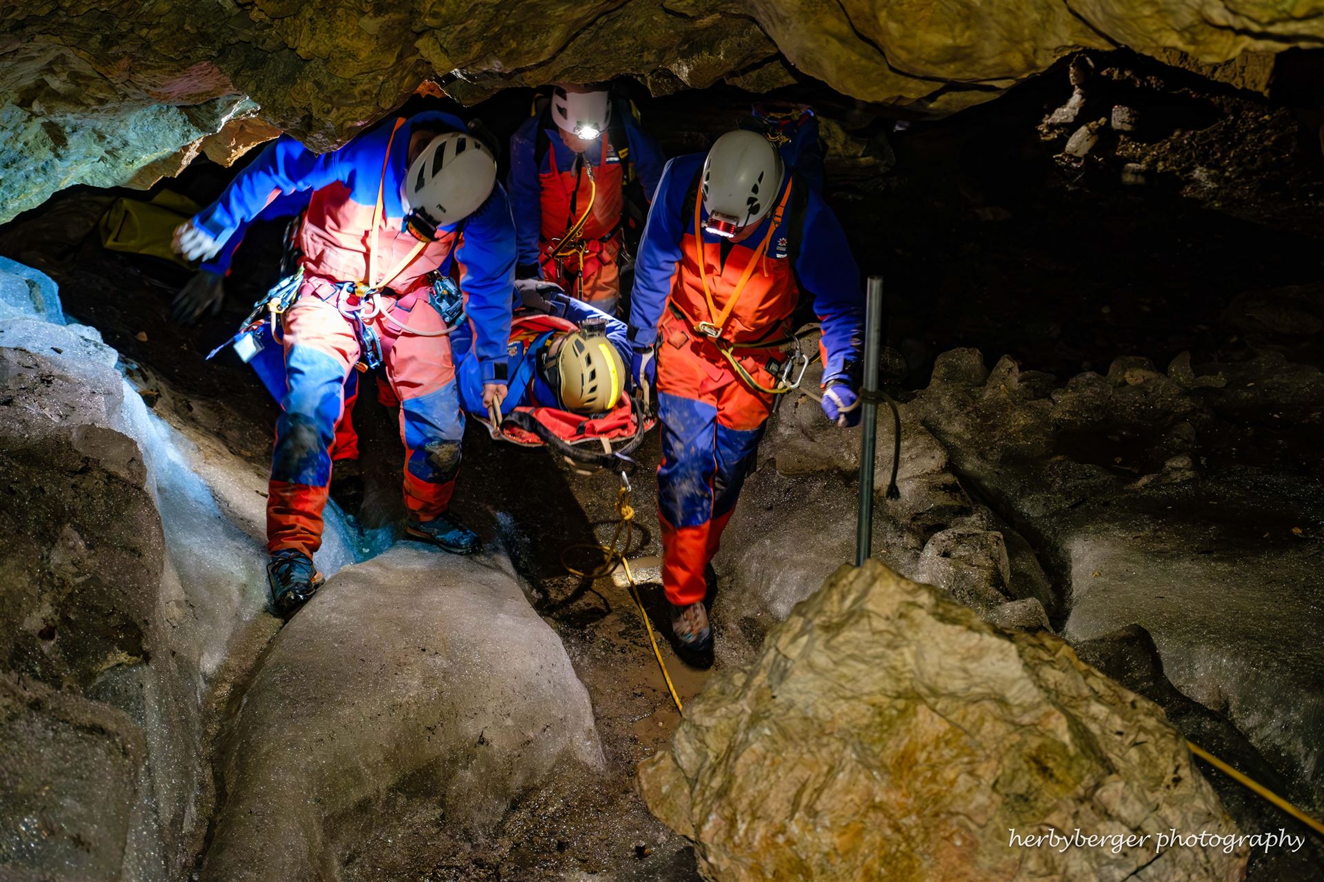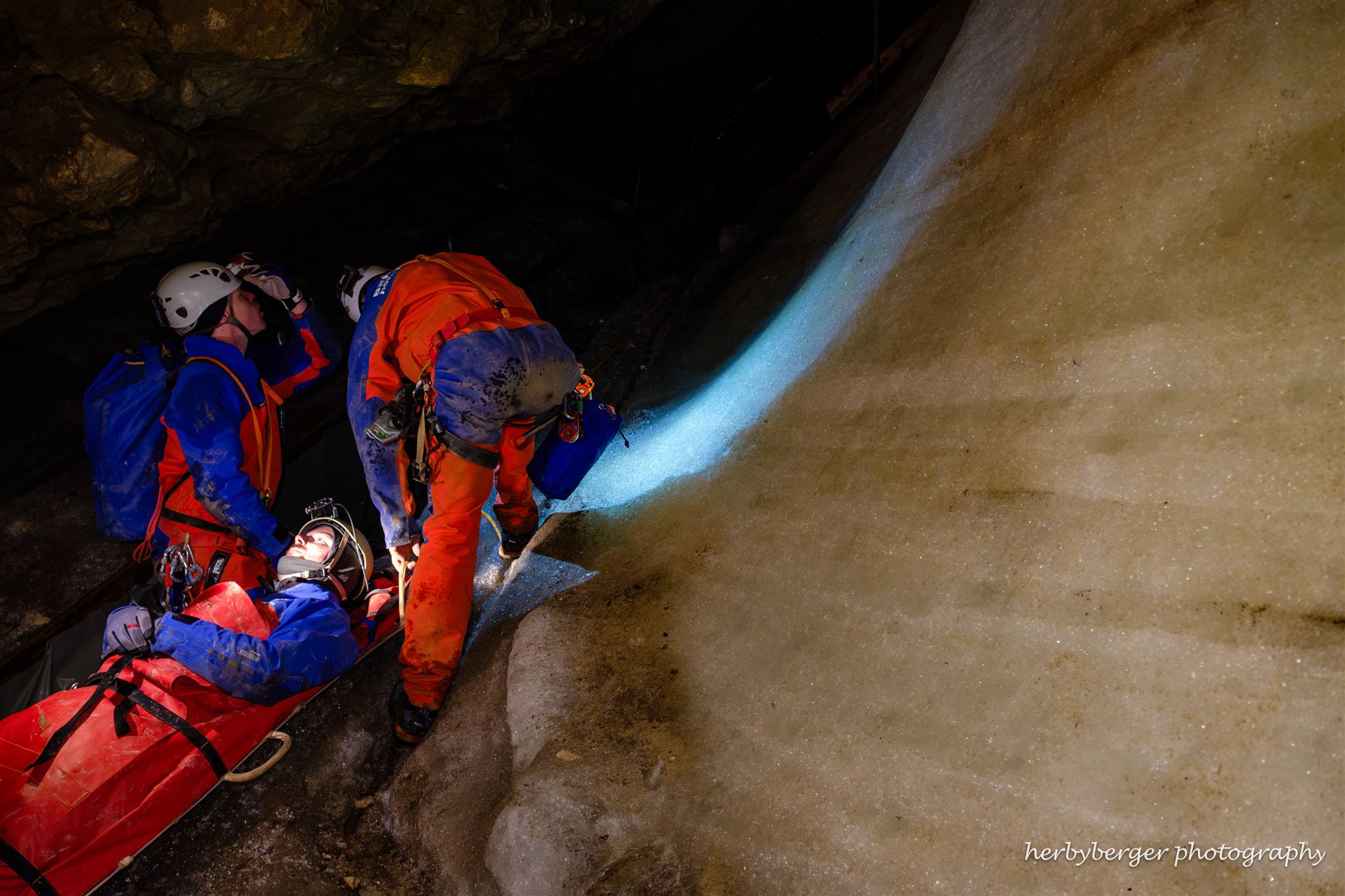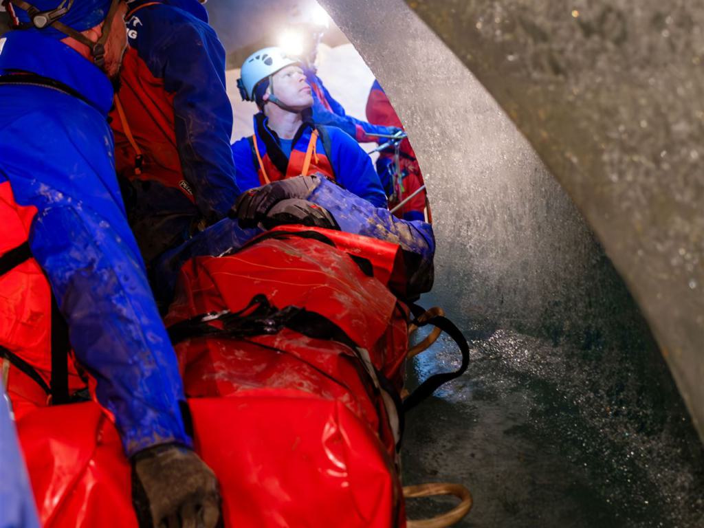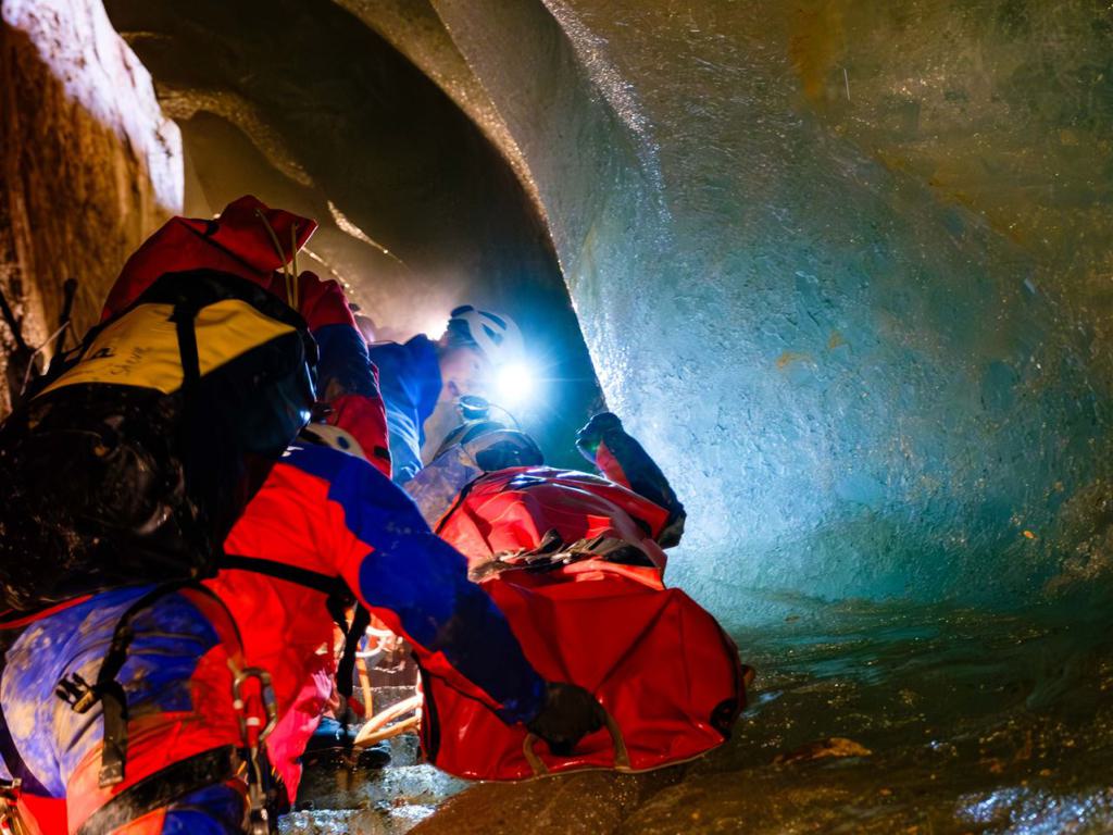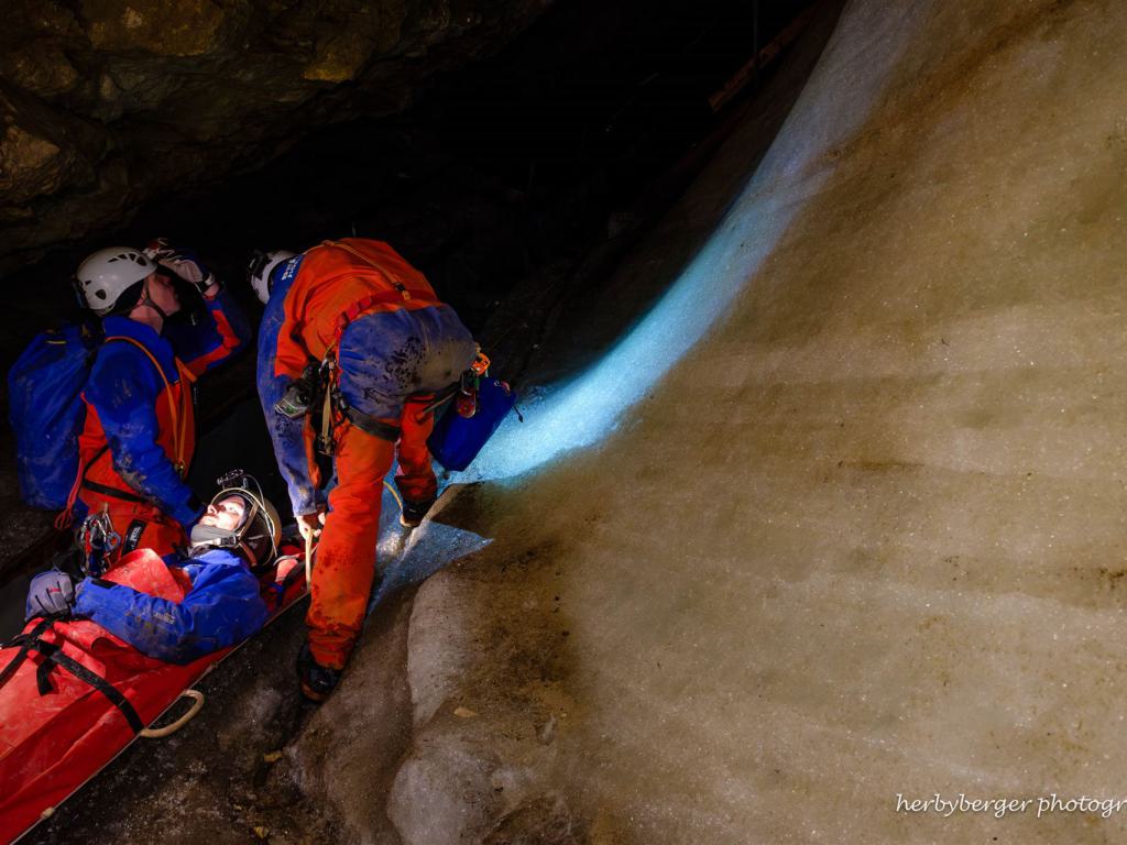 Freiwillige Höhlenretter üben in Deutschlands größter Eishöhle den Transport eines Verletzten zurück ans Tageslicht.