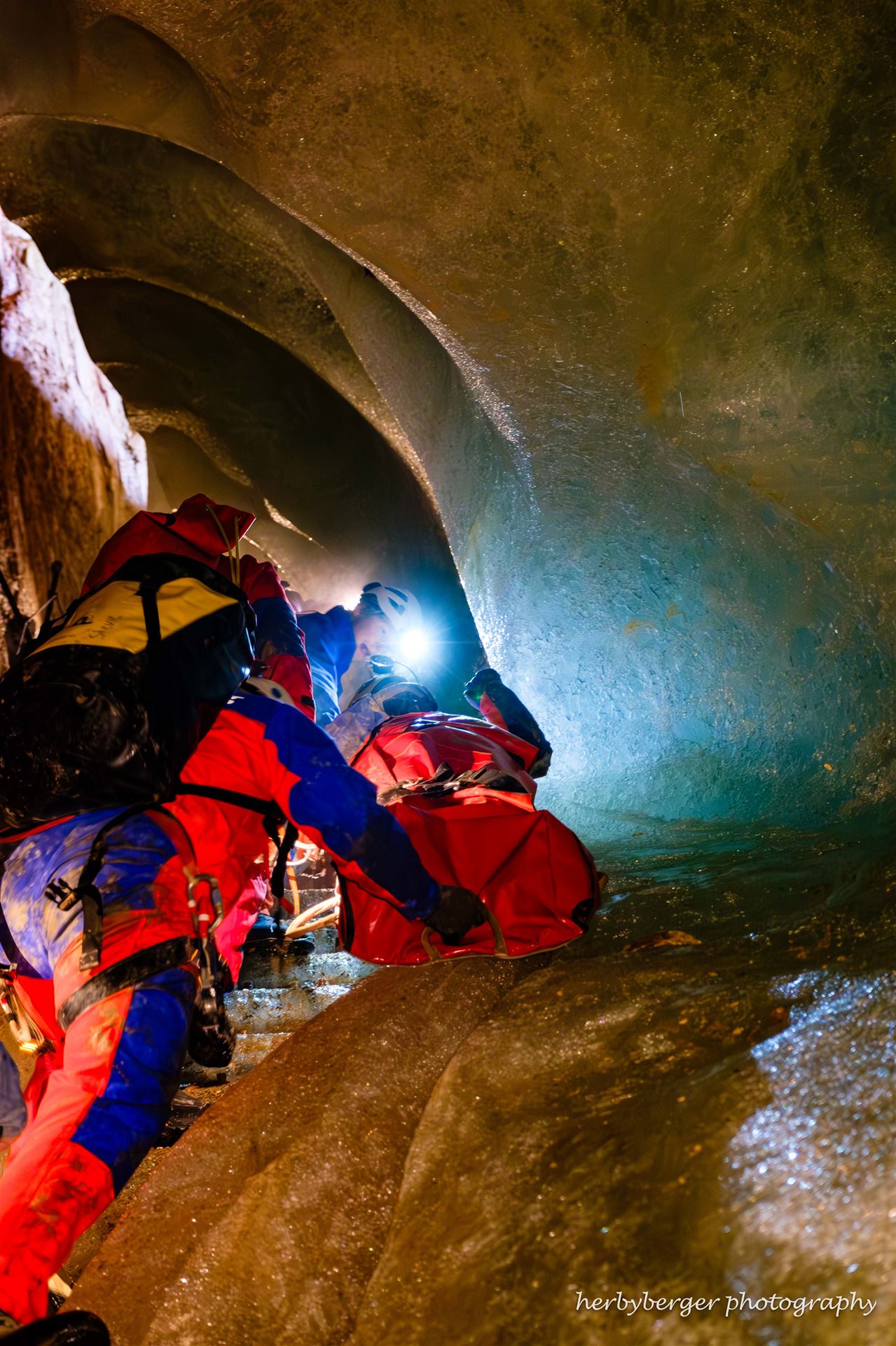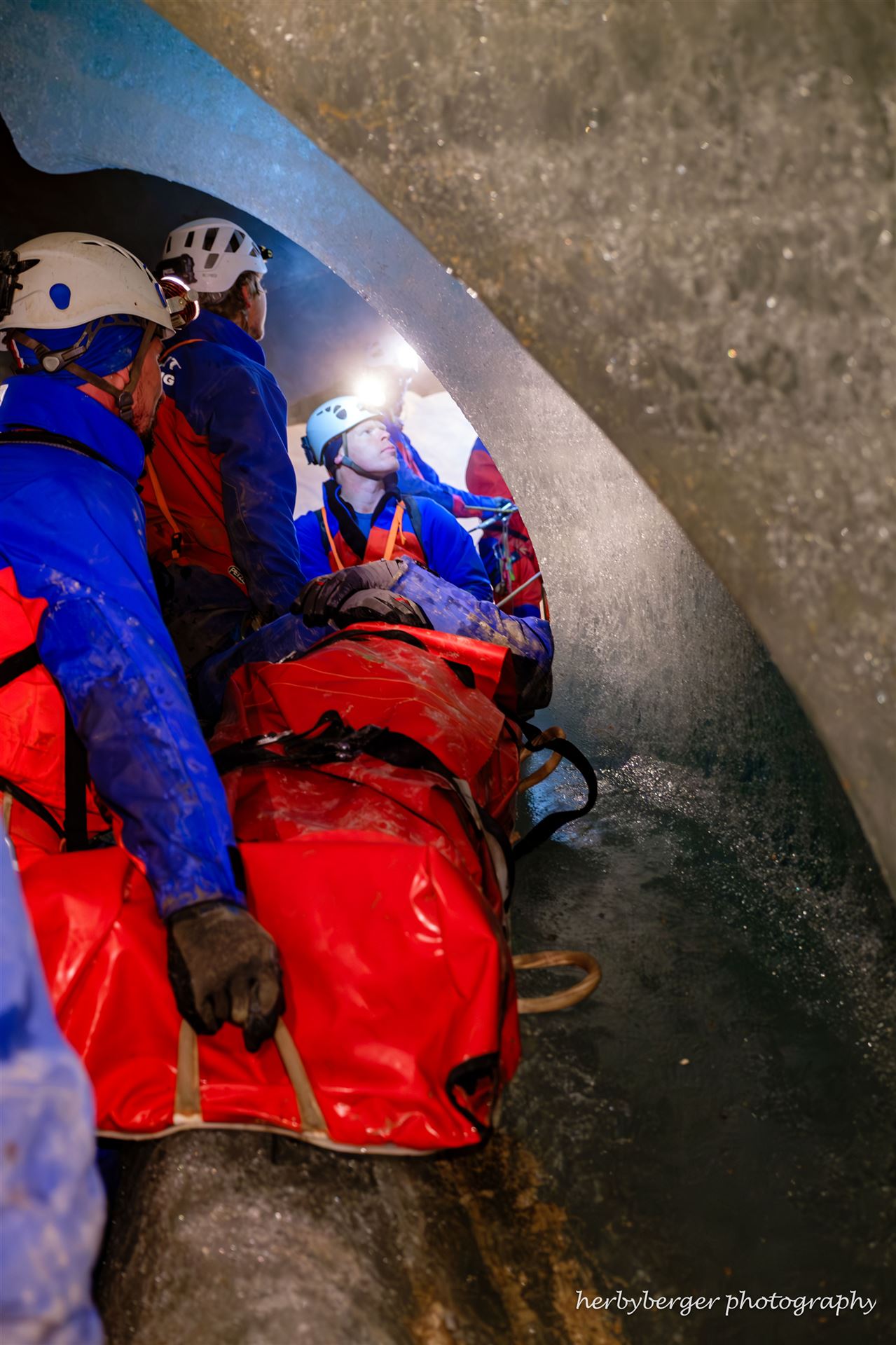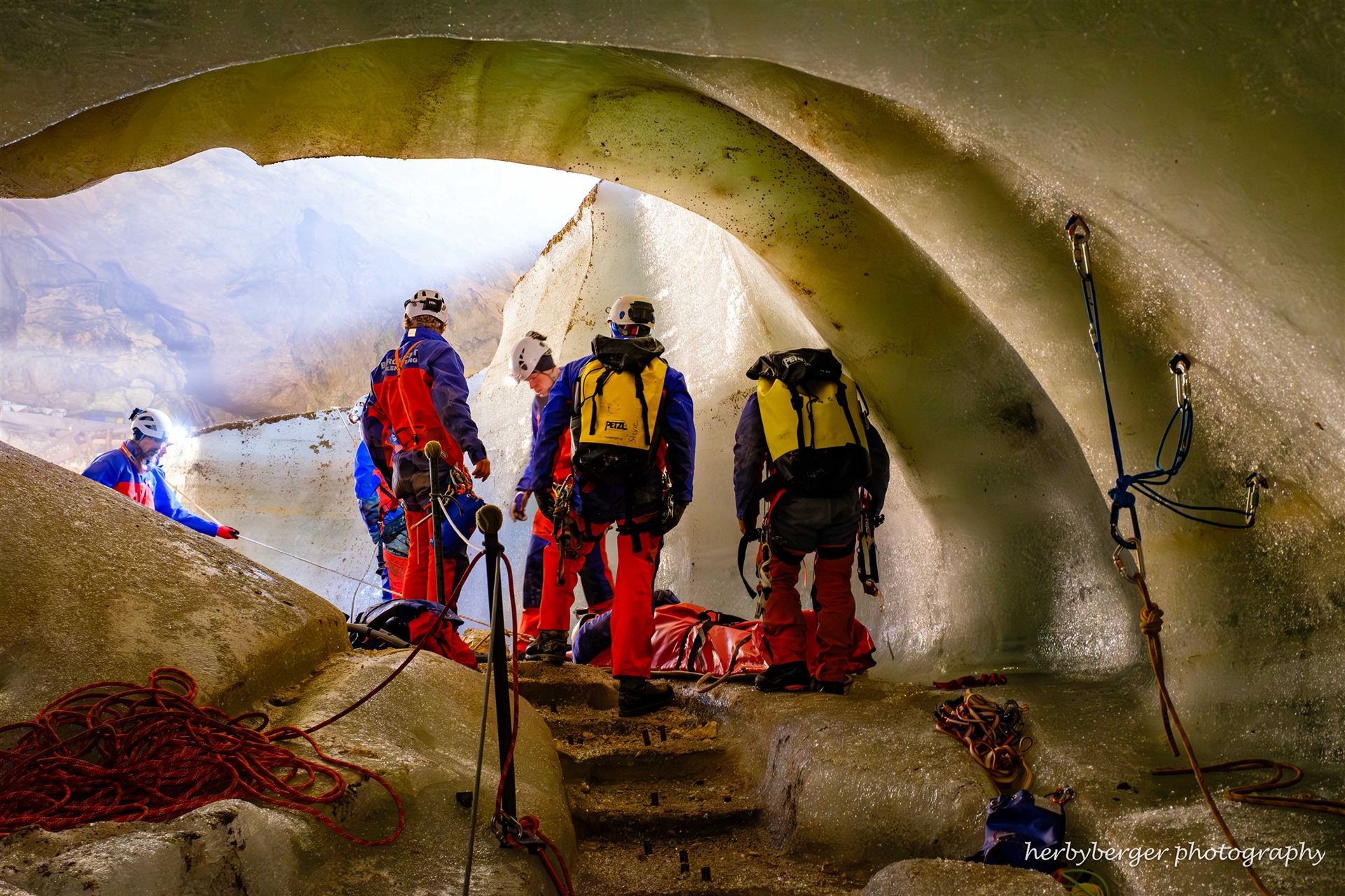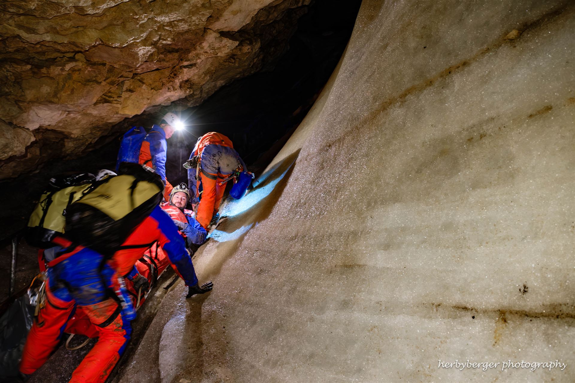 Freiwillige Höhlenretter üben in Deutschlands größter Eishöhle den Transport eines Verletzten zurück ans Tageslicht.