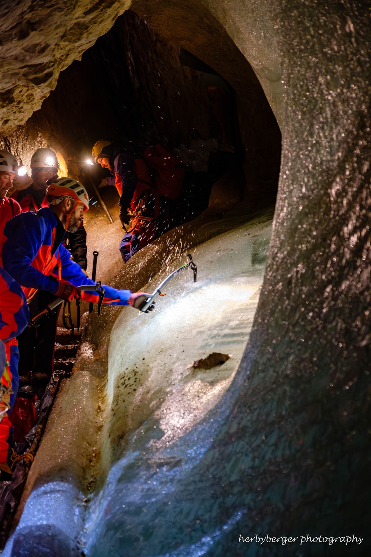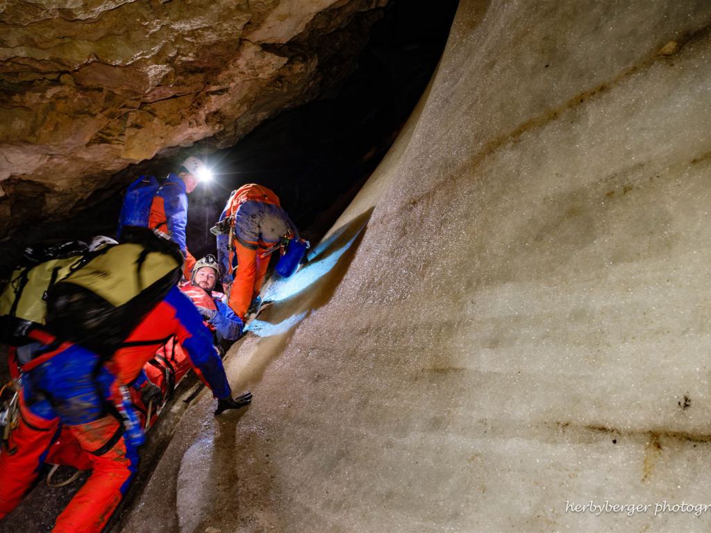 „Um den Verletzten sicher und schonend bis an den Übergang vom Eis zum Felsen zu bringen, mussten wir eine Rettungsstrecke mit Gegenzugmethode und einen seilversicherten Aufstieg im Eis aufbauen“, erklärt Mayer. Danach konnten einige Retter noch in aller Ruhe weitere eisfreie Abschnitte der Höhle erkunden. Am Nachmittag gings zurück zur Hütte, wo sich alle Teilnehmer bei der Nachbesprechung nochmal für den Abstieg mit Hans Kranawetvogls Gulaschsuppe für den Abstieg ins Tal stärken konnten.